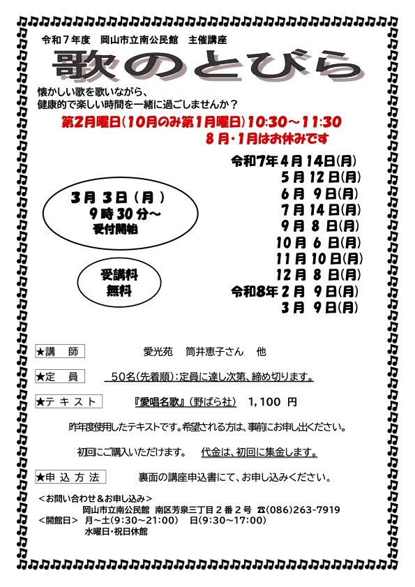 岡山市立南公民館 南区芳泉三丁目 2 番 2 号 ☎(086)263-7919
