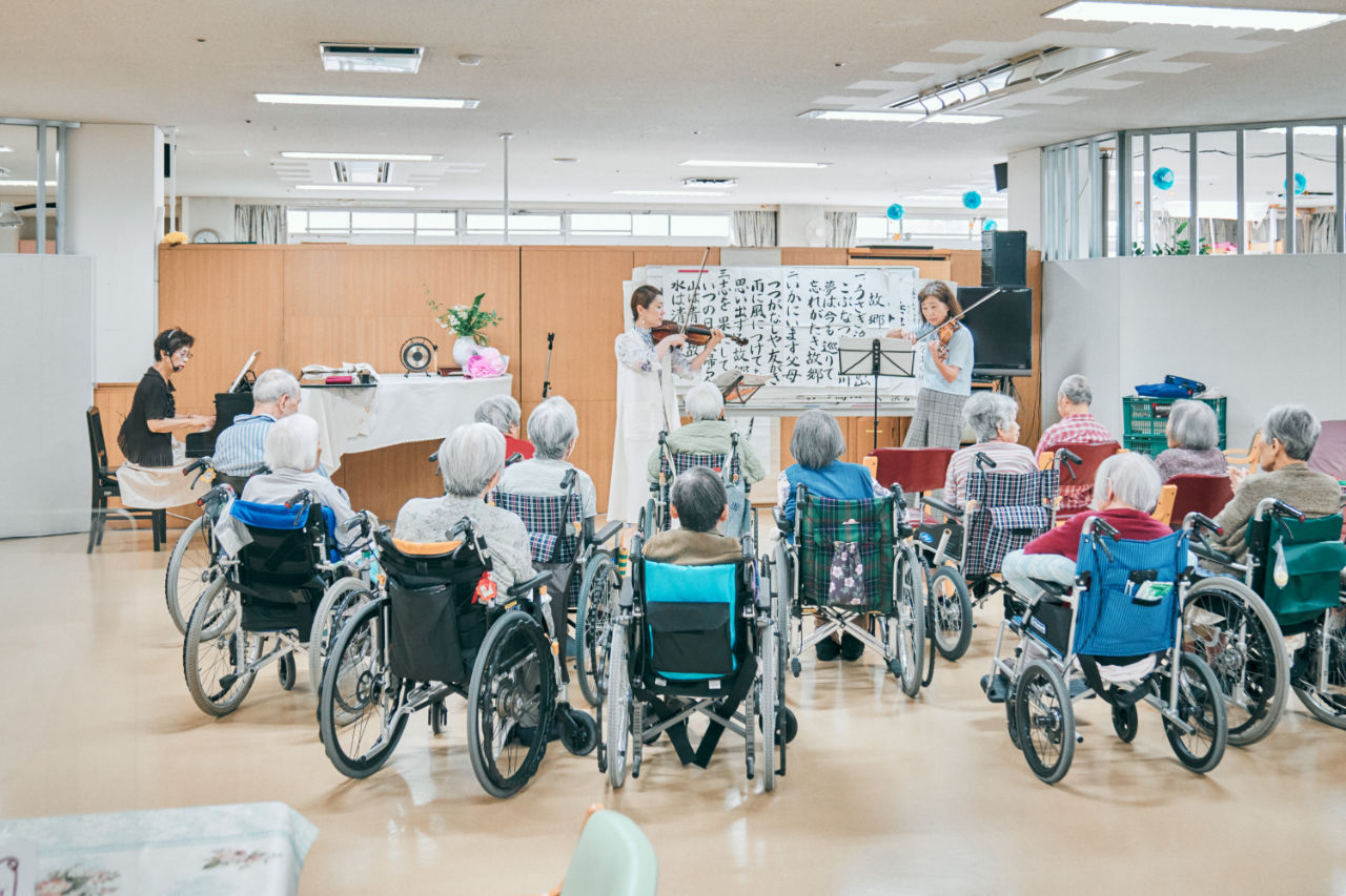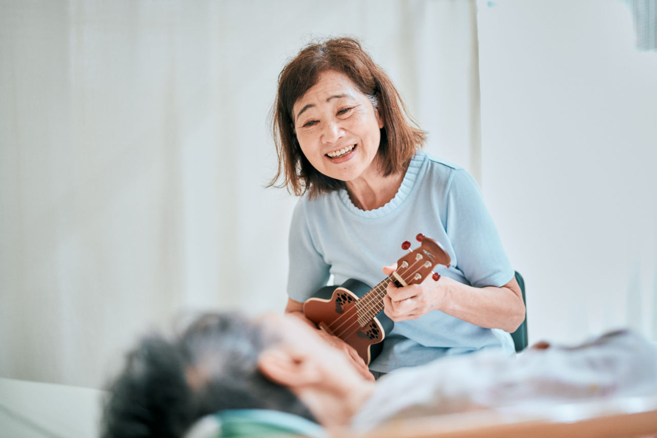 平成8年から取り組んできた中で、多くのご利用者様に改善や向上が見受けられました。 たとえば発語のない全介助の方が、歌えるようになったことをきっかけに簡単な受け答えが出来るようになり、食事が取れるようになった事例もあります。 愛光苑では、ピアノ、ヴァイオリン、ウクレレ、オートハープなどを使用しています。