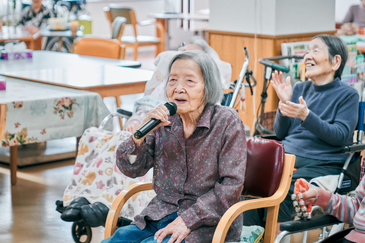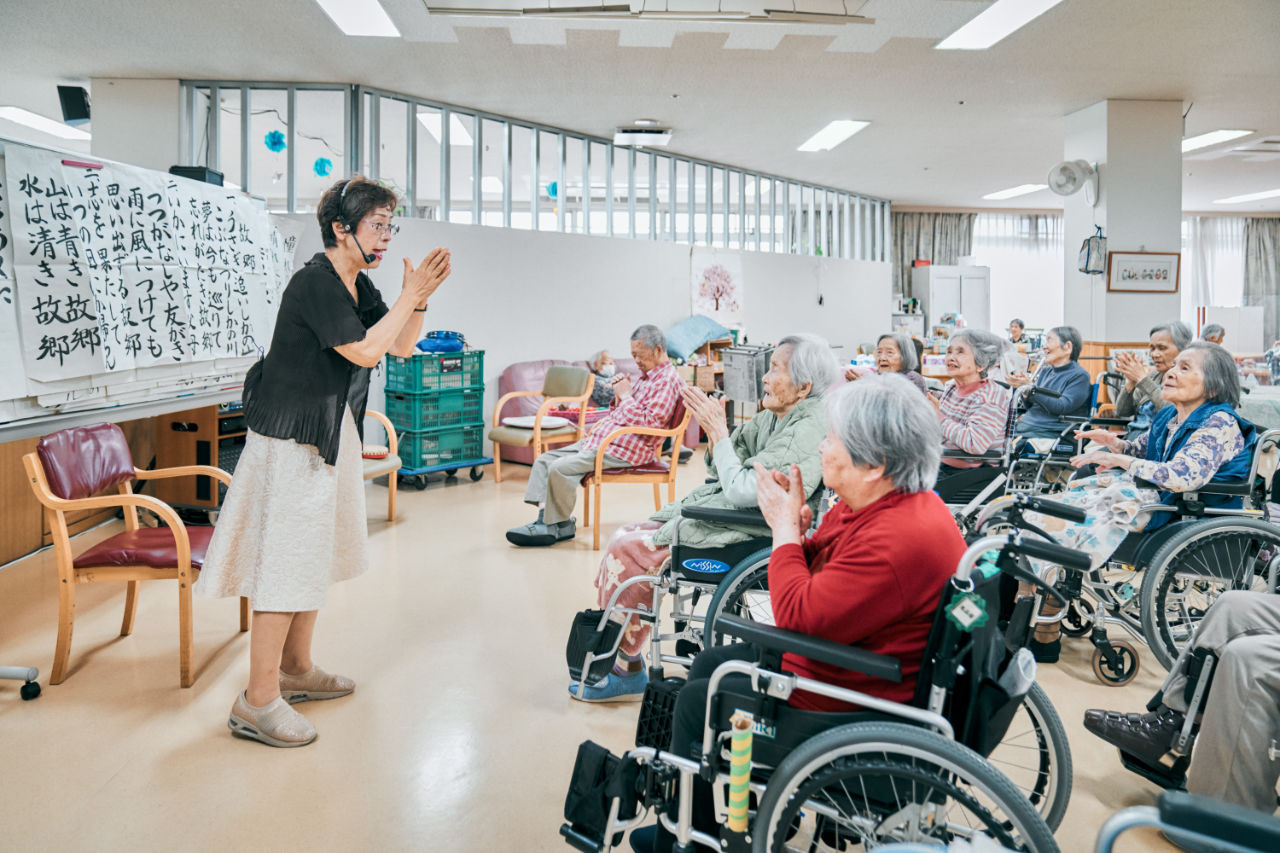 1曲ごとに、懐かしい歌を通して「過去の回想」を行い、歌に合わせて体を動かし「身体機能の維持」を目的として様々な活動を行っています。