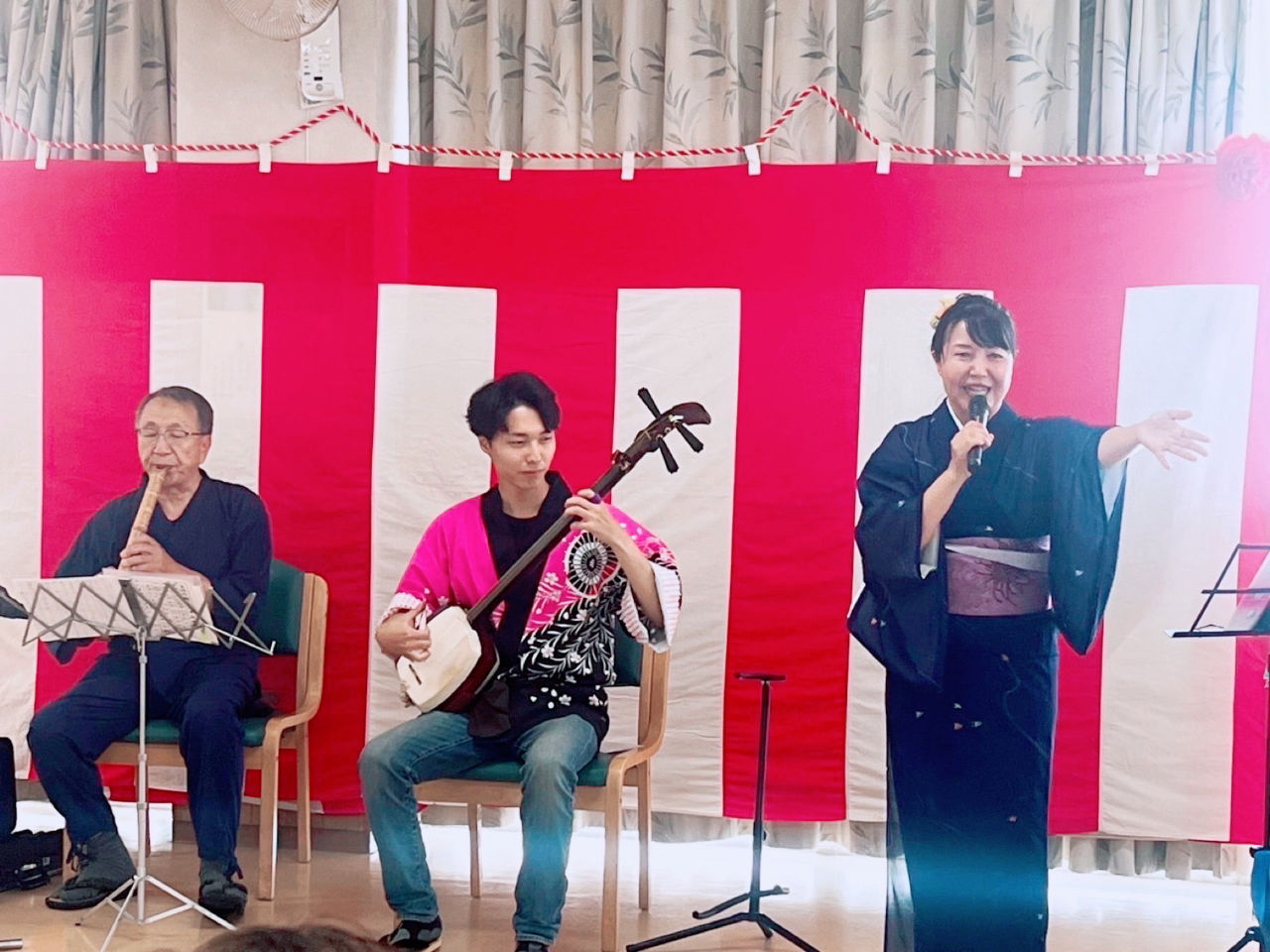 音楽療法の場では、音楽療法士、 介護職員、地域ボランティア、ご家族など、さまざまな立場からサポートに入り、1時間に10曲ほどをみんなで歌い, 合奏をします。